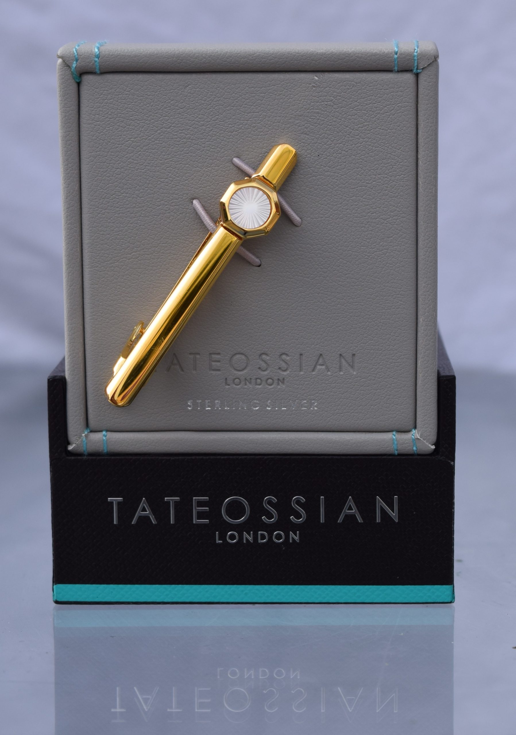 The Tateossian Sunburst Semi-Precious Tie Clip in Yellow Gold and White Mother of Pearl offers a luxurious design that exudes sophistication. Crafted with precision, its sunburst pattern showcases the intricate details of white mother-of-pearl inlays, complemented by a sleek yellow gold finish. This tie clip not only enhances your attire but also highlights your unique style with its combination of premium materials. Ideal for formal occasions or adding a touch of elegance to everyday wear, it’s a timeless accessory designed for discerning tastes. Elevate your wardrobe with this remarkable piece of craftsmanship.